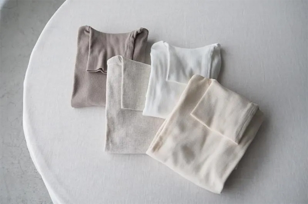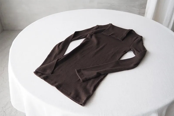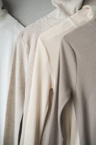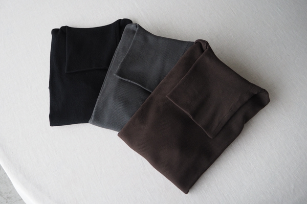 テレコ編みの生地はリブ編みよりもソフトな伸縮性を持ち、体に馴染むやさしい着心地が特徴です。