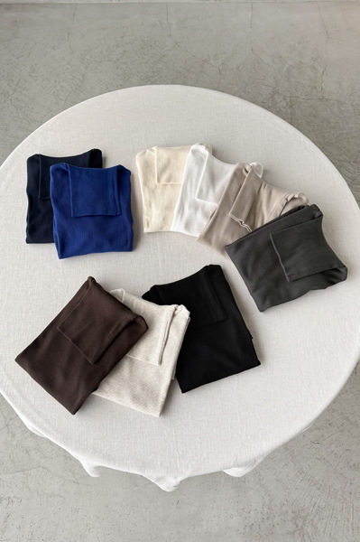 カラーはホワイト、オートミール杢、オフホワイト、グレージュ、ブルー、ネイビー、ブラック、チャコール、ダークブラウンの9色、サイズは38のワンサイズです。