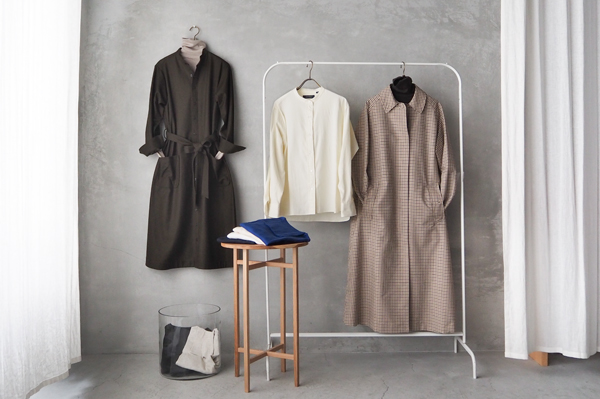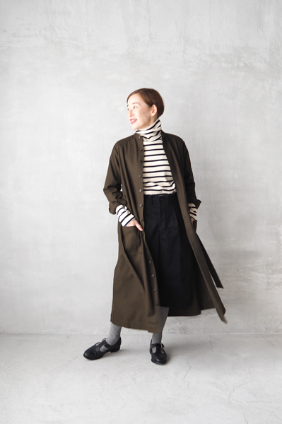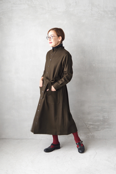 「michel beaudouin」ウールカシミヤワンピース、「HAND ROOM WOMENS」バンドカラーシャツ、「SOUTIENCOL」ステンカラーコート、「NOUVELLES DU PARADIS」コットンテレコタートル