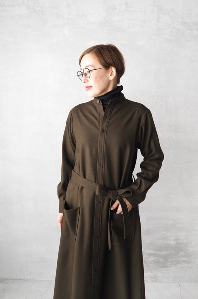 滑らかなカシミヤ混ウールの〈スタンドカラーワンピース〉は、前を開けて軽やかなコートとしても活躍します。