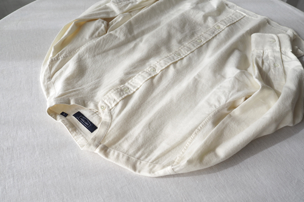 ややドロップショルダー気味の楽なシルエットで、一番上までボタンを留めても苦しくない、ゆとりのある首周り。