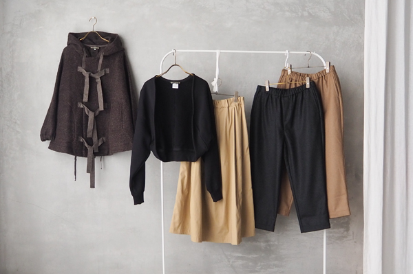 デイリーに活躍するボトムス〈チノスカート〉や〈フランネル イージーテーパードパンツ〉も並びました。