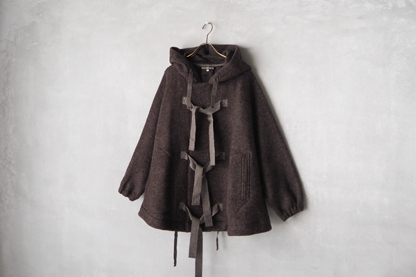 1940年代の船員用保護服をモチーフにした、前身頃が長く、後身頃が短い独特のAラインシルエット。