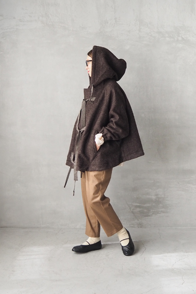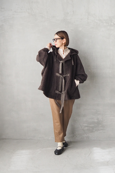 カジュアルでリラックスした雰囲気を醸し出すやや大きめのフードは、顔周りを華奢に見せてくれる効果も。