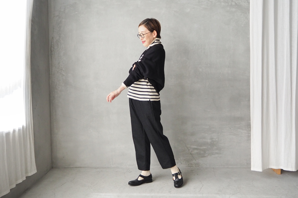 すっきりとしたショート丈の身頃にワイドスリーブのバランスが独特の雰囲気を醸し出しています。