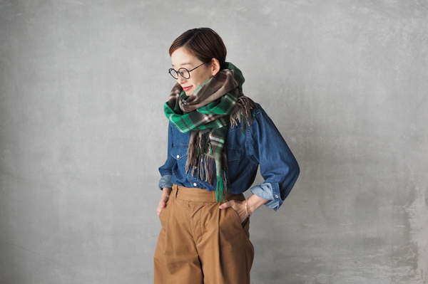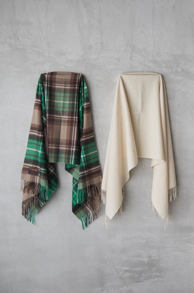 これからの季節に欠かせない〈ラムズウールストール〉は、秋冬の着こなしに華やかさをプラスしてくれるグリーンチェックとクリーム無地の2色をご用意しております。