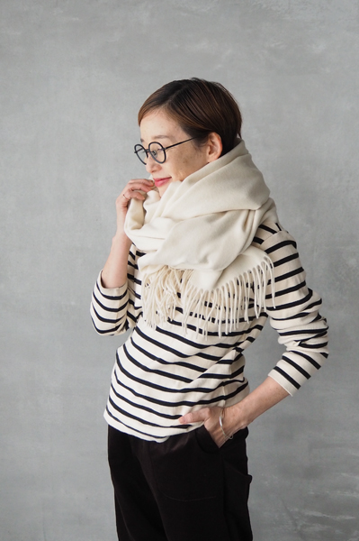 大判のストールはふんわりと肩にかけたり、二重に巻いても程よいボリューム感で、巻き方のアレンジも自在。