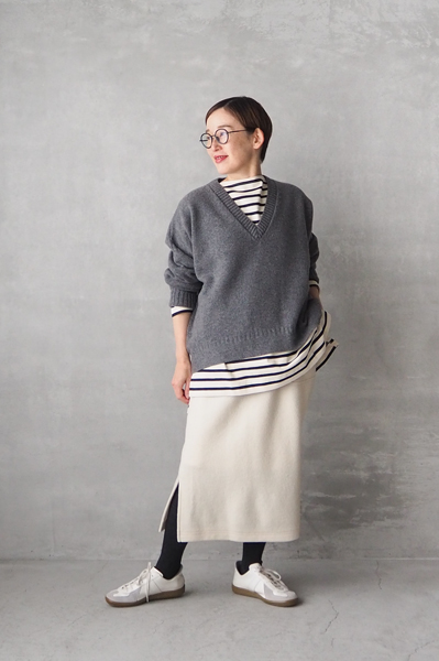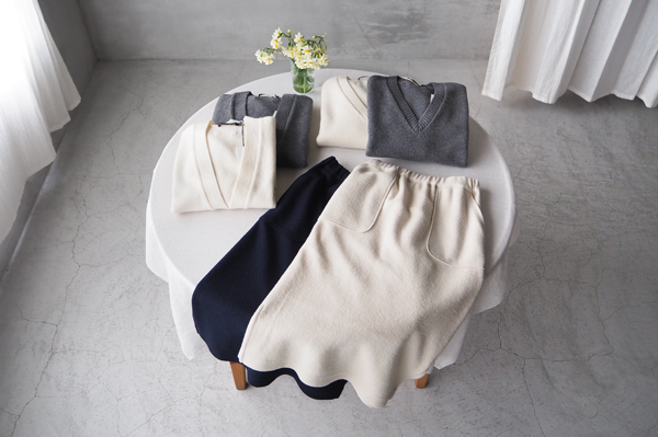 「nicholson & nicholson」リラックスフィット Vネックカーディガン〈JANE〉と Vネックニット〈AURA〉、「Vent d’ouest」ブークレ イージータイトスカート