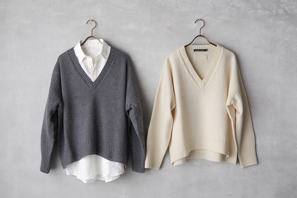 シャツやカットソーとのレイヤードスタイルが楽しめるリラックスフィットの〈Vネックカーディガン〉と〈Vネックニット〉。