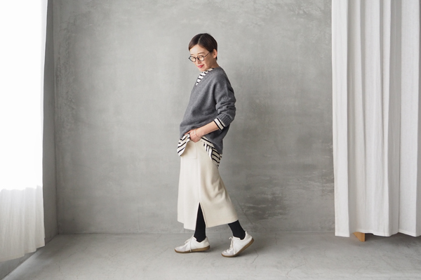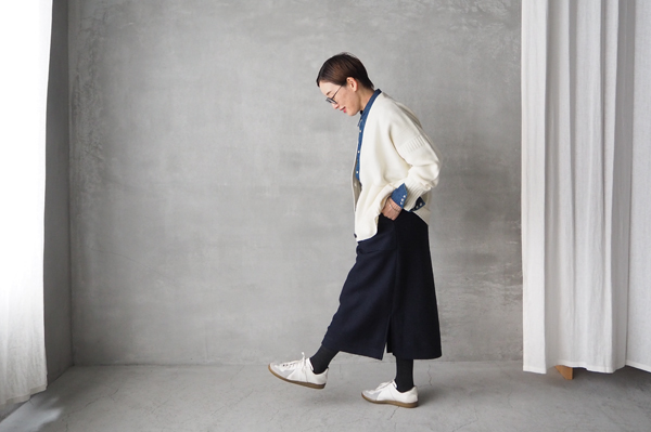 モコモコとしたブークレ素材の〈イージータイトスカート〉は、暖かみがありつつ、すっきりとしたシルエットでアウターやニットとのコーデをバランスよく見せてくれる一枚です。