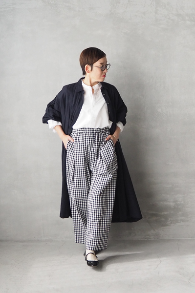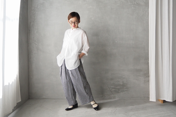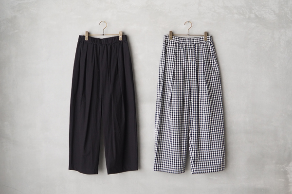 軽やかなコットンタイプライターの〈タックイージーパンツ〉はコーディネートのポイントになるギンガムチェックとベーシックなブラック無地の2色をご用意しております。