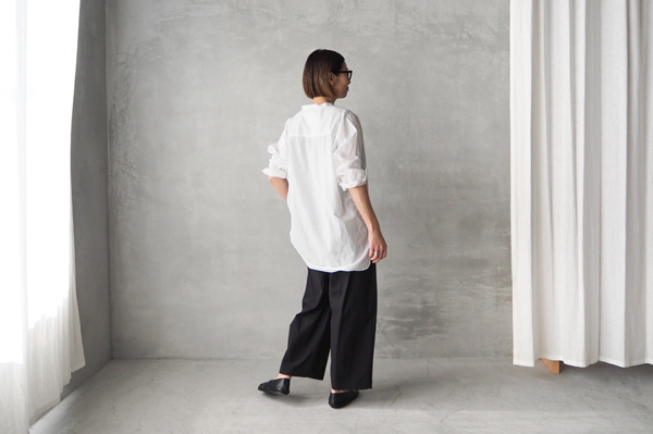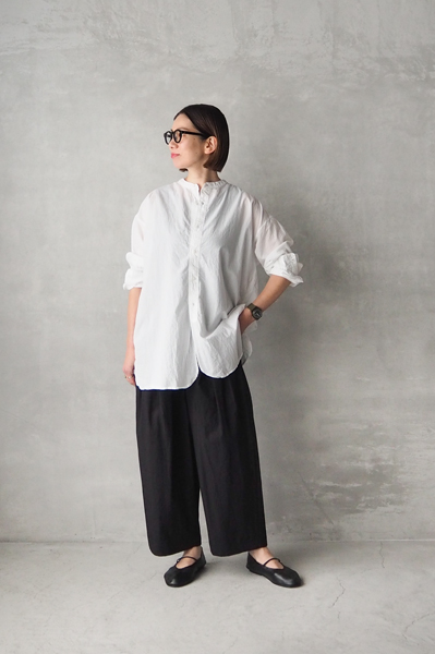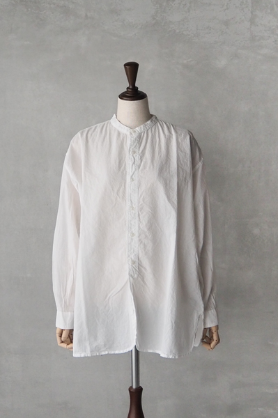 軽やかなコットンローン素材のバンドカラービッグシャツ。