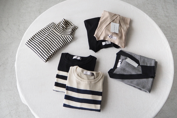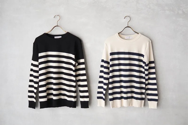 アウターのインに重ねて、着こなしのアクセントにもなるボーダー柄の〈クルーネックニット〉と〈タートルネックニット〉。