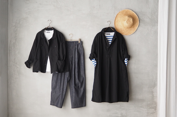 ヴィンテージのワークウェアをベースにした〈ダブルジャケット〉と〈ワークギャザーワンピース〉は軽やかなリネンコットン素材でロングシーズン活躍する心強いアイテム。