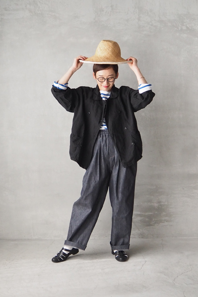 「ARMEN」リネンコットンのダブルジャケットとワークギャザーワンピース、「nicholson & nicholson」ライトデニム ツータックイージーパンツ